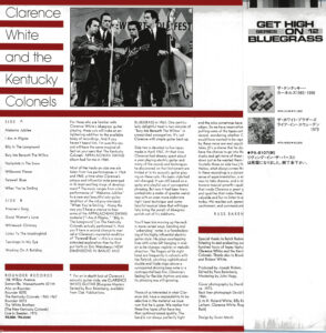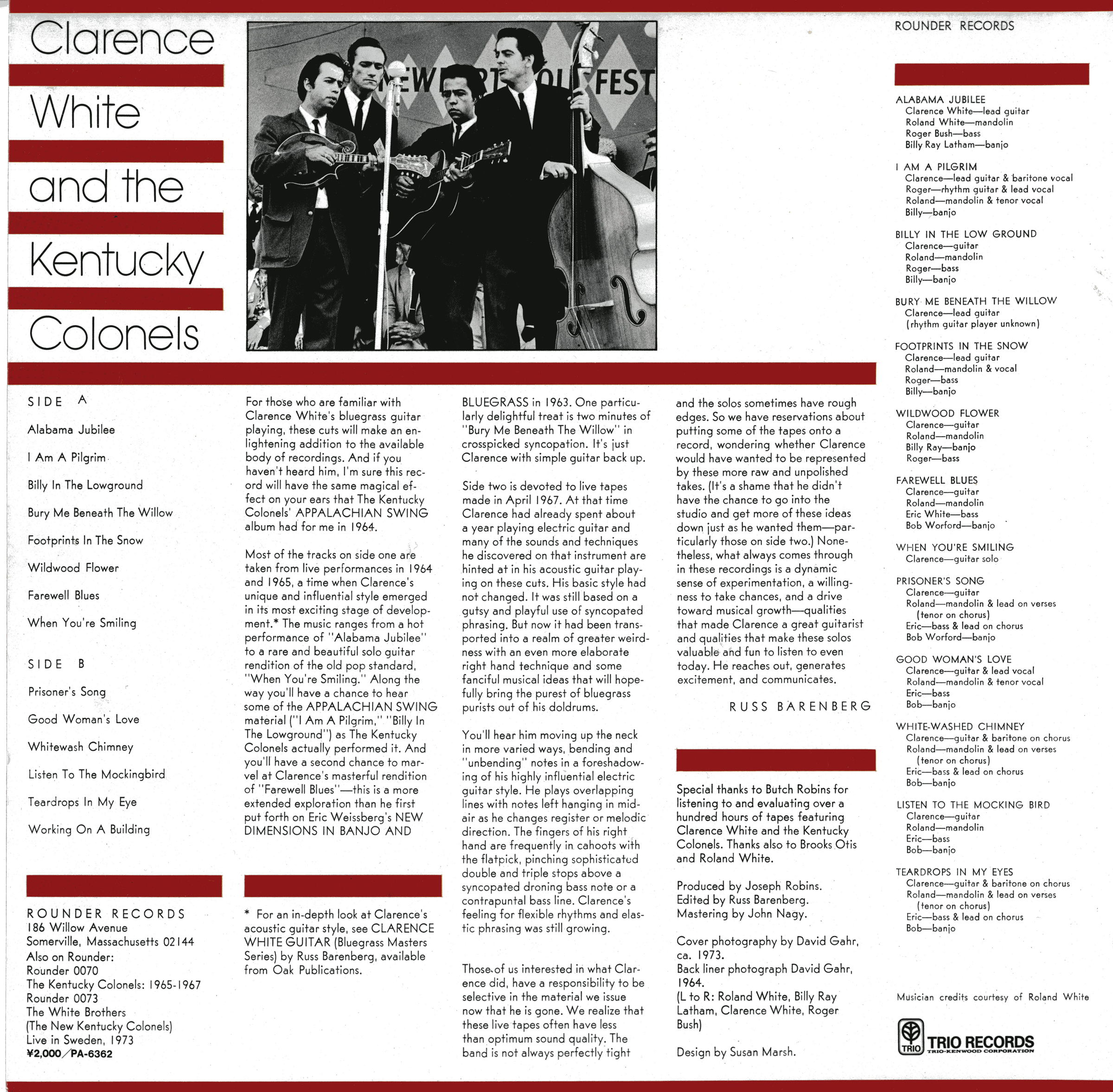 Special thanks to Butch Robins for listening to and evaluating over a Hundred hours of tapes featuring Clarence White and the Kentucky Colonels.Thanks also to Brooks Otis and Roland White.