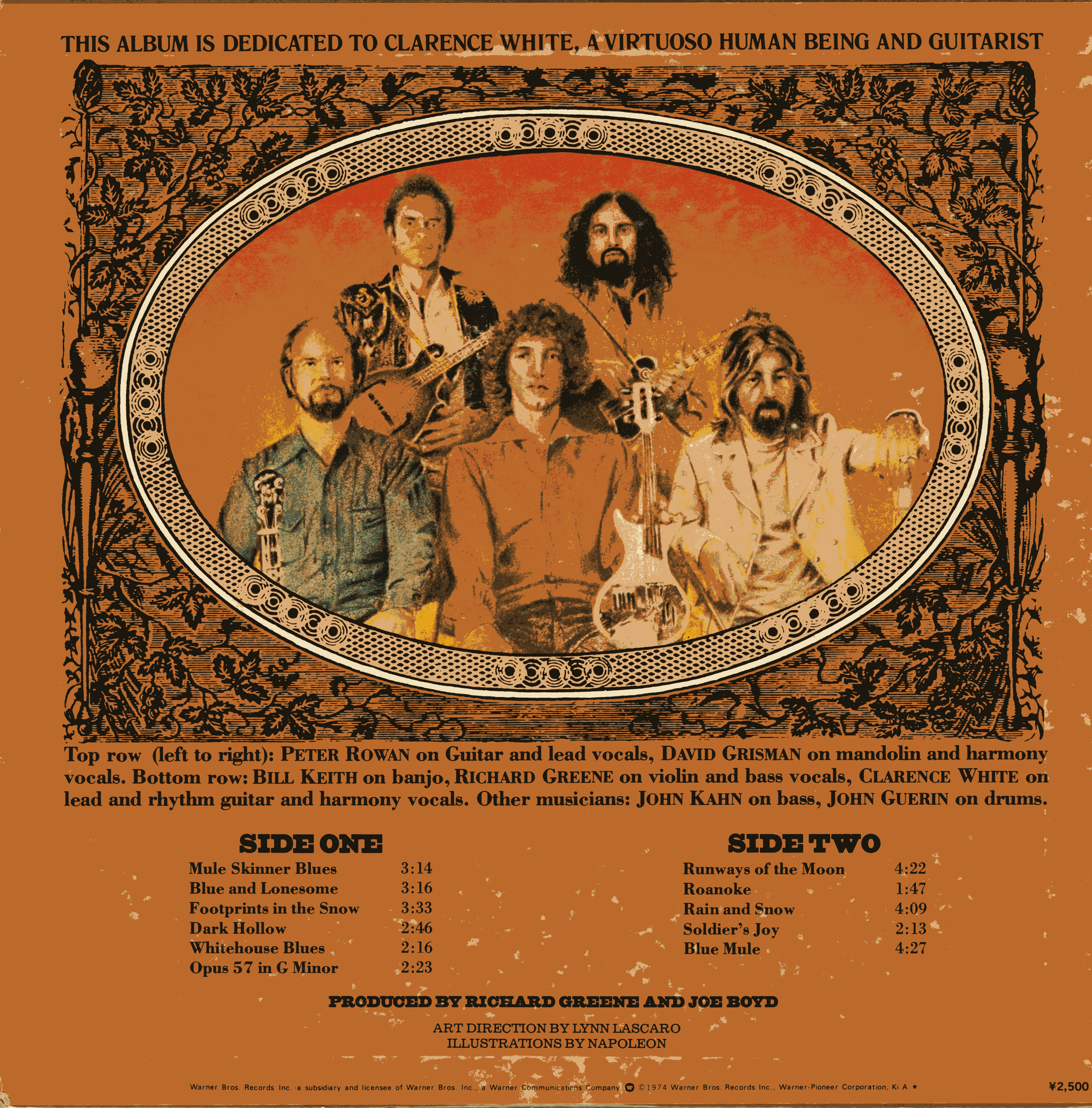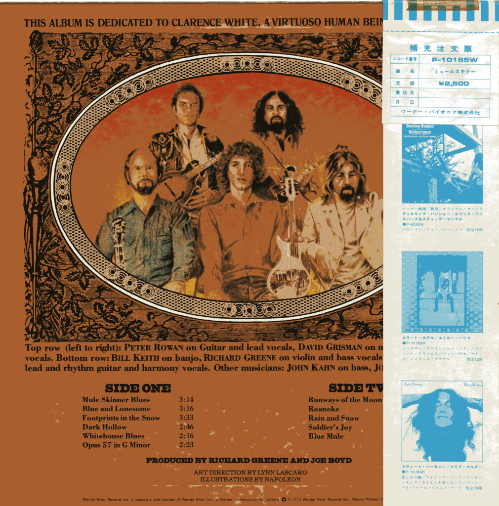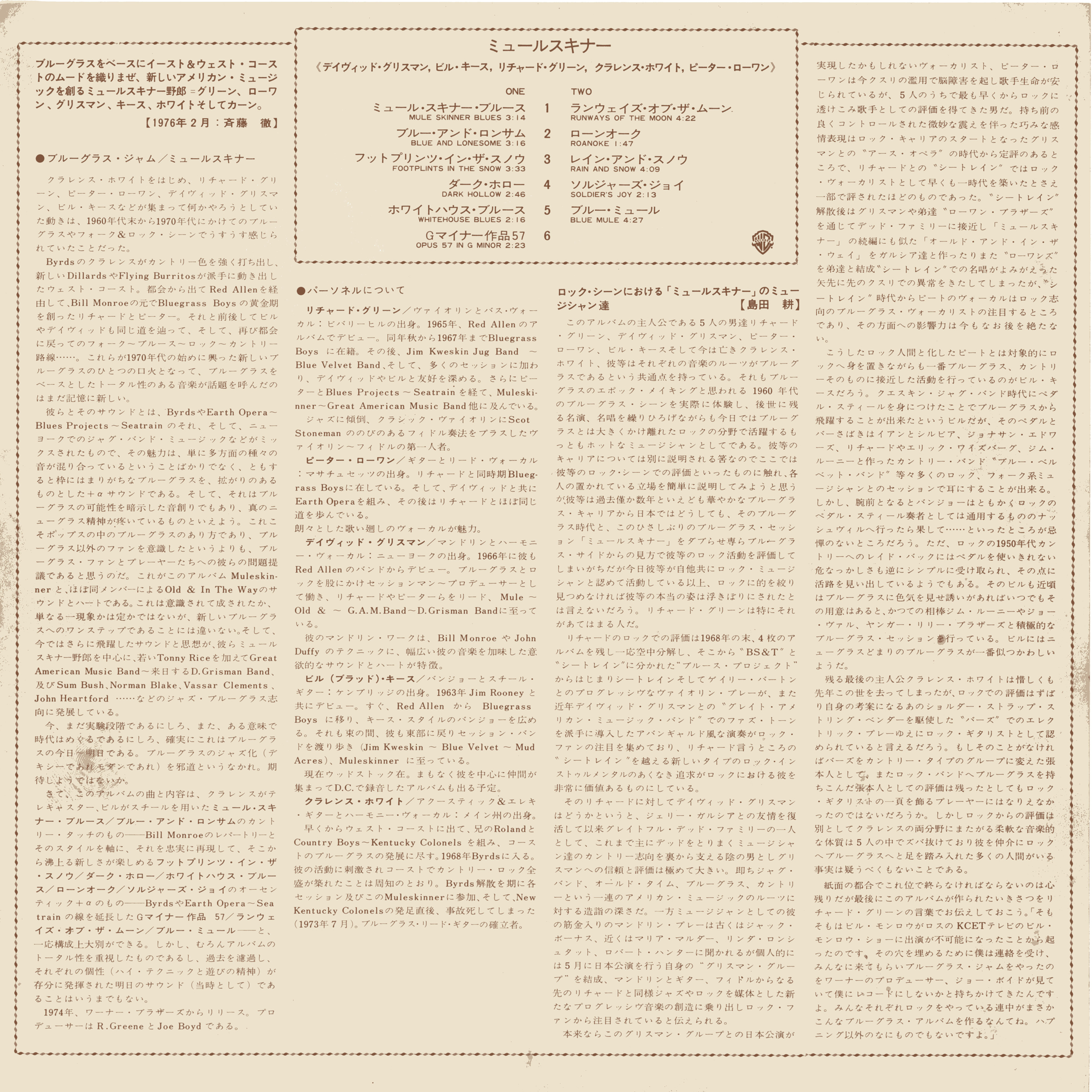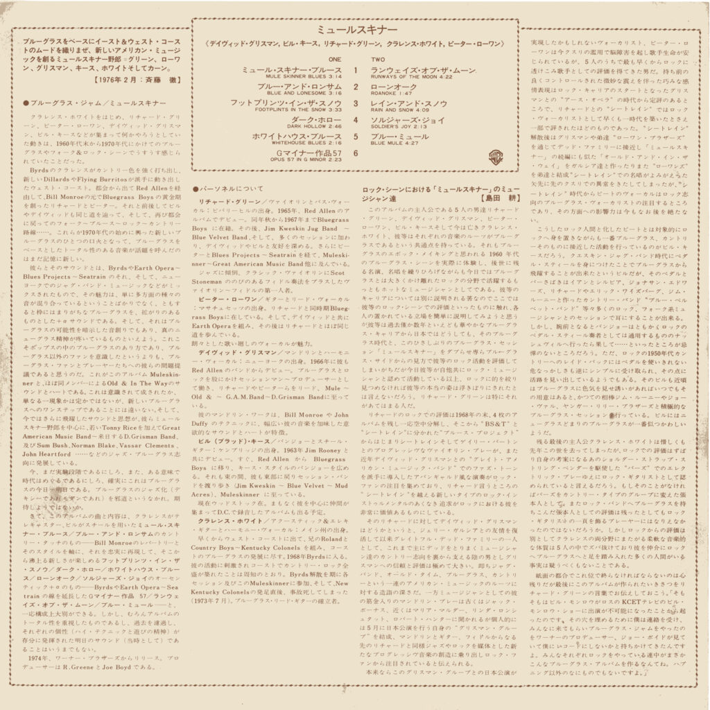 ブルーグラスをベースにイースト&ウエスト・コートストのムードを織りまぜ、新しいアメリカン・ミュージックを創るミュールスキナー野郎 = グリーン、ローワン、グリスマン、キース、ホワイトそしてカーン。 【1976年2月 : 斉藤 徹】